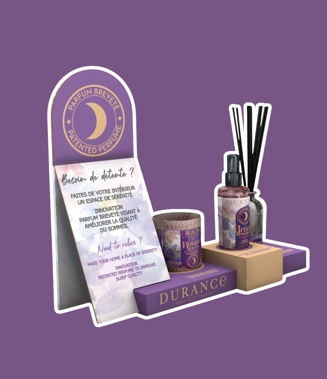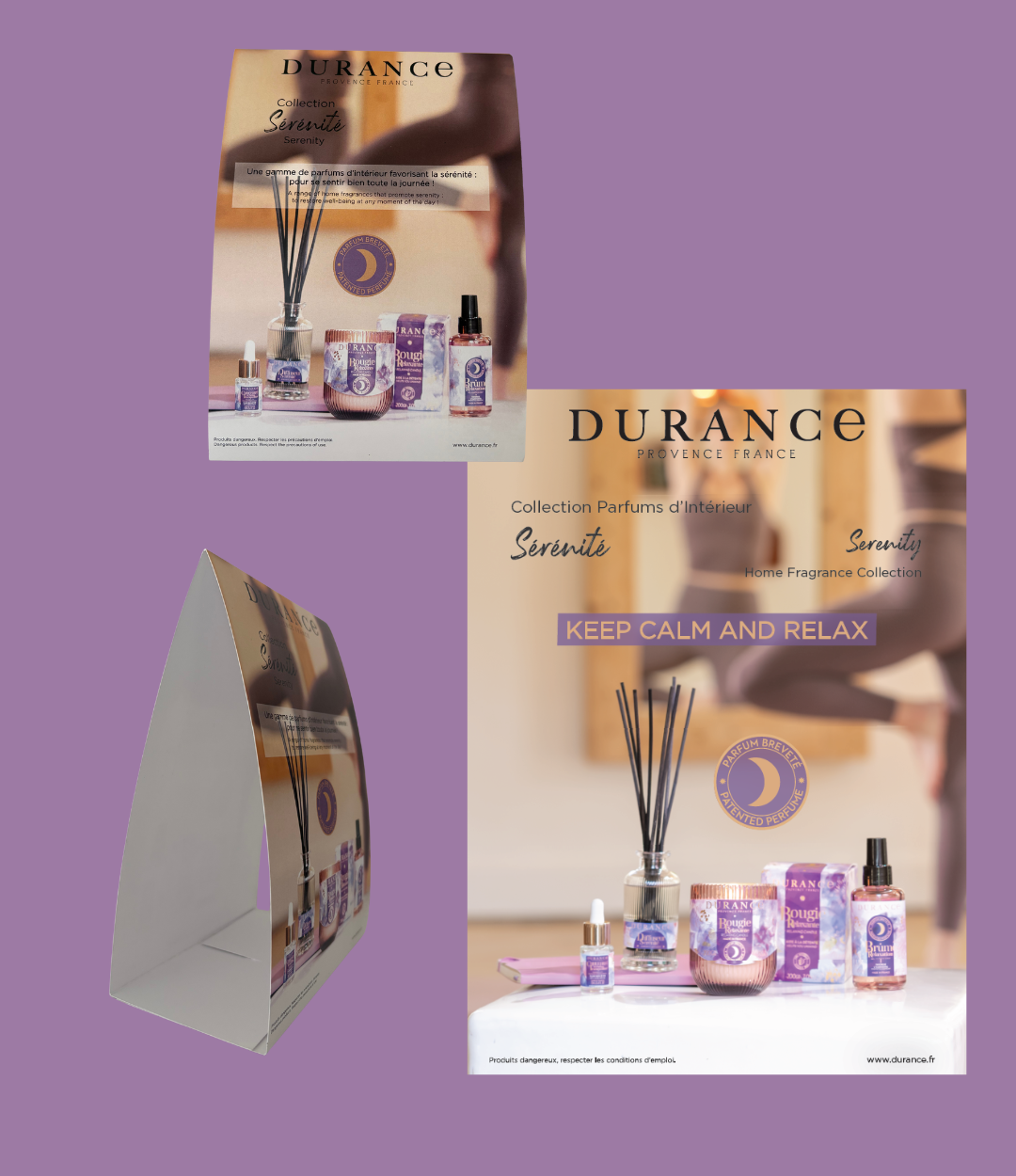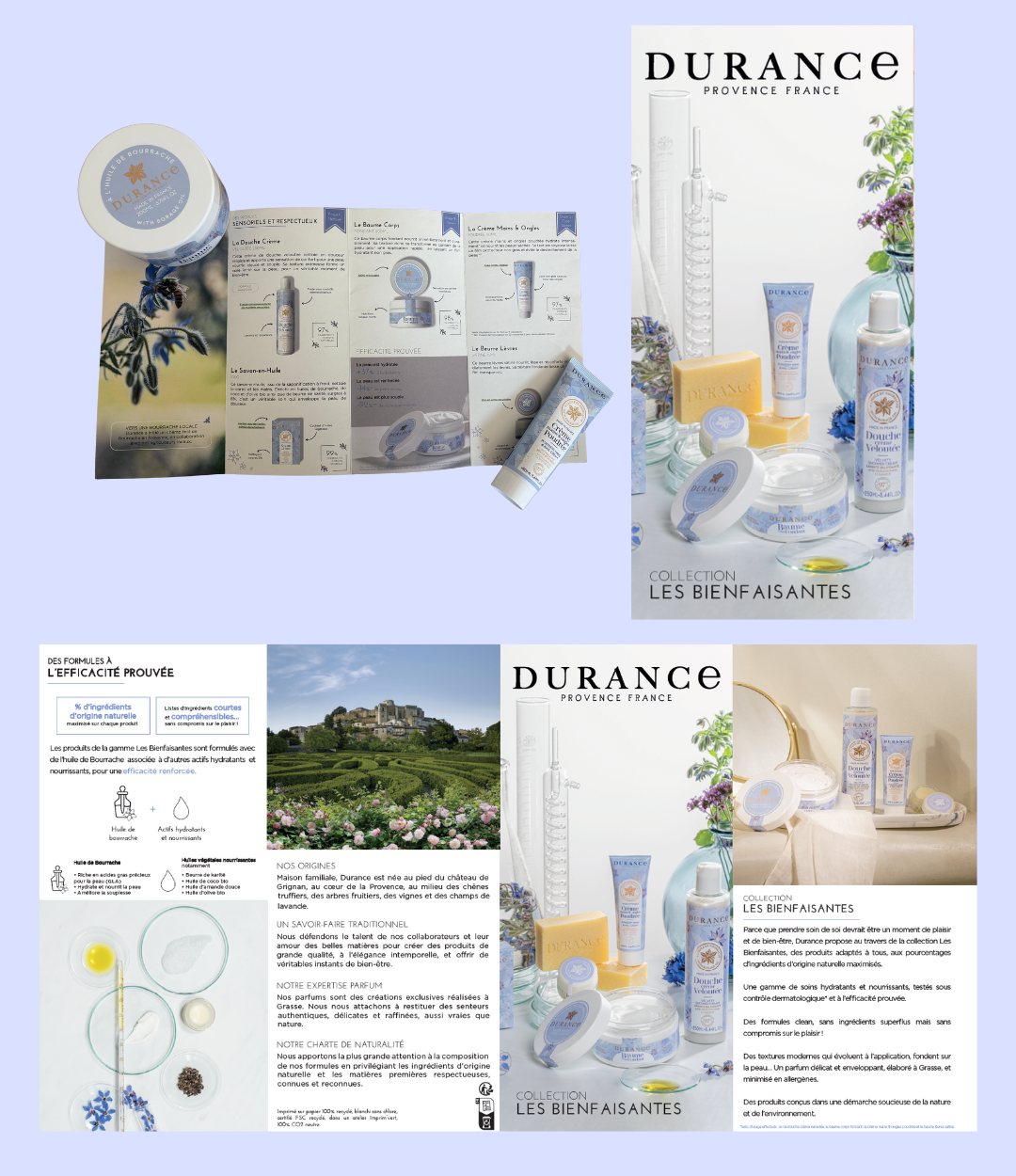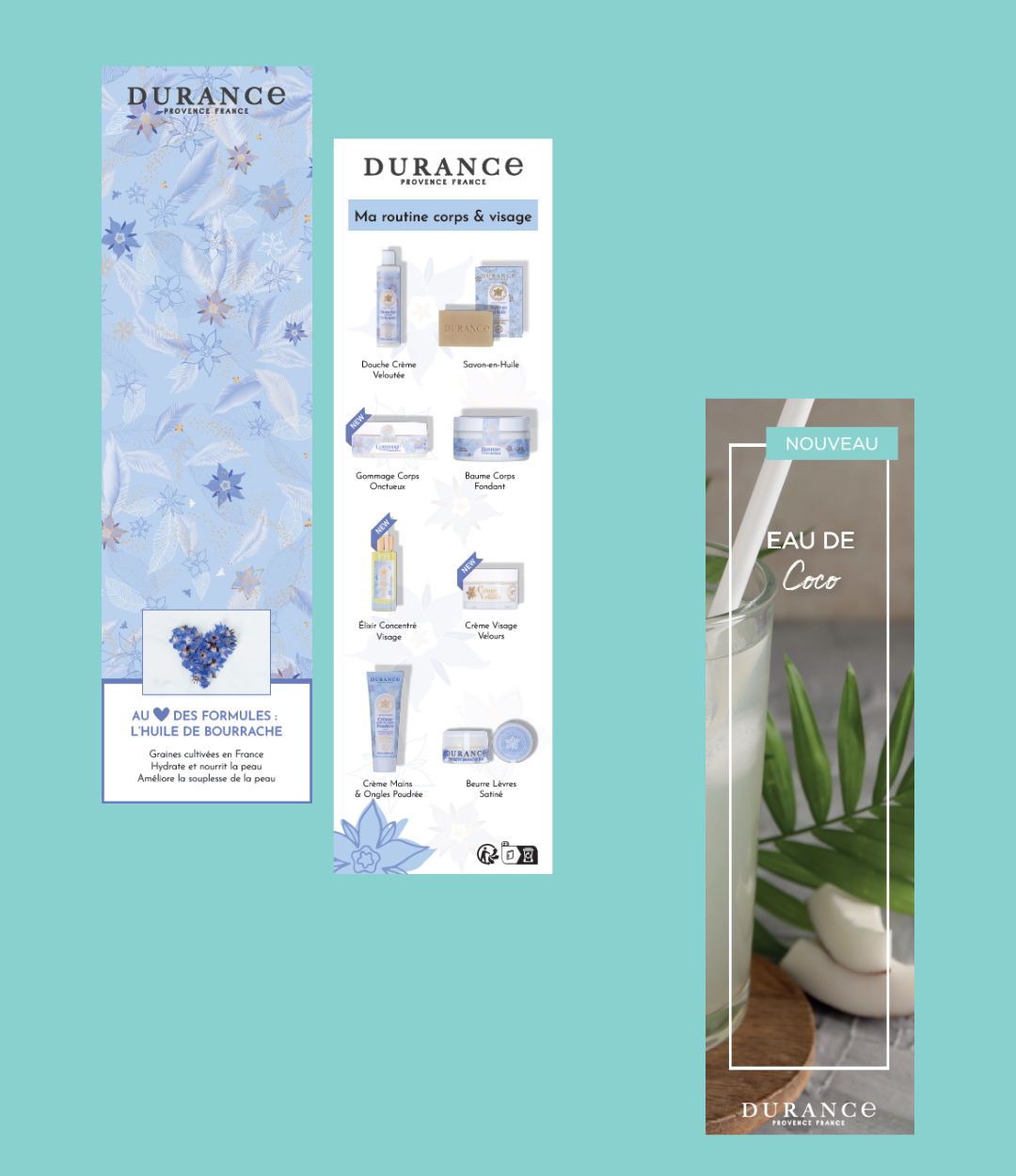 De petits supports raffinés conçus pour présenter les univers produits et rituels de soin. À la fois esthétiques et informatifs, ils prolongent l’expérience Durance et accompagnent le client dans la découverte des gammes.