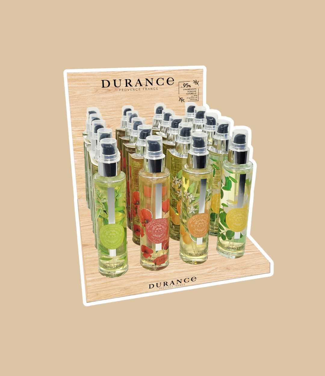 Des supports identitaires qui assurent une présence homogène de la marque sur tous les points de vente. Leur design épuré et leurs finitions soignées reflètent les valeurs de Durance : authenticité, raffinement et naturel.